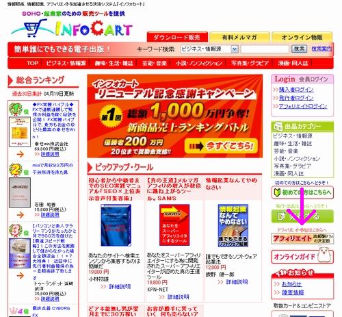 INFOCART インフォカート アフィリエイト登録INFOCARTのバナーを張って、高額報酬をゲット! あなたは商品販売の成功報酬(販売額の1〜70%)を受け取ることができます。 情報・コンテンツ販売では、物品販売より高いコミッション率が期待できます。