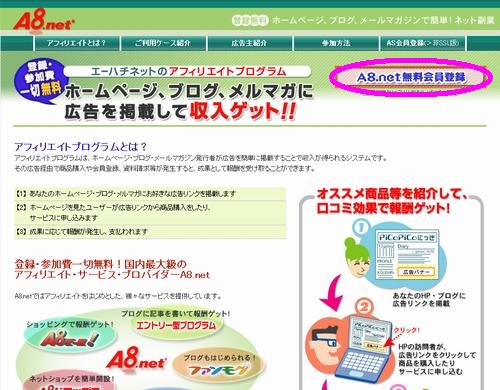 すると次のようなページが開きます。 マルで囲んだ「A8.net無料会員登録」をクリックします。
